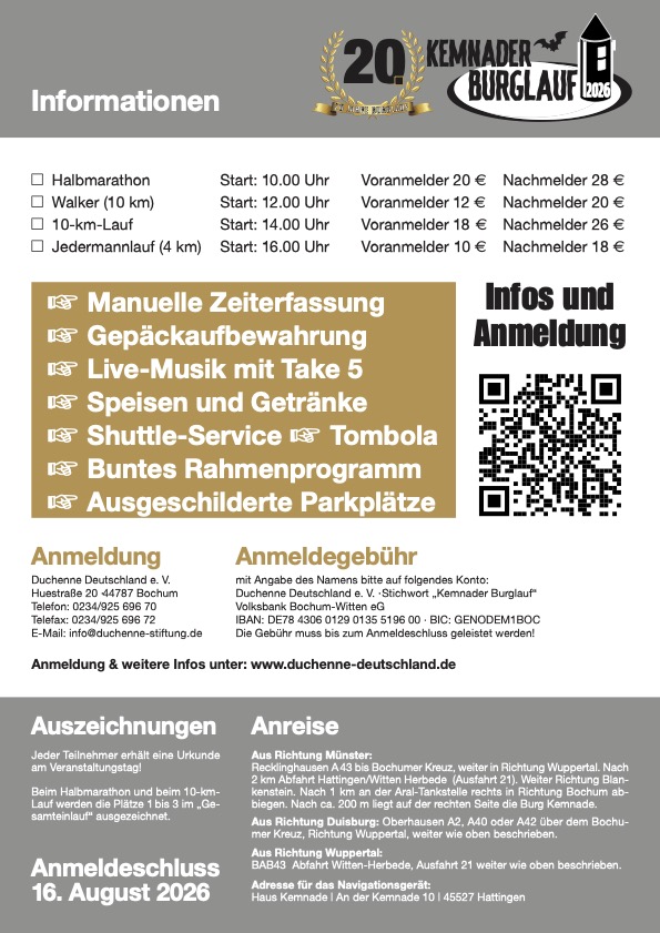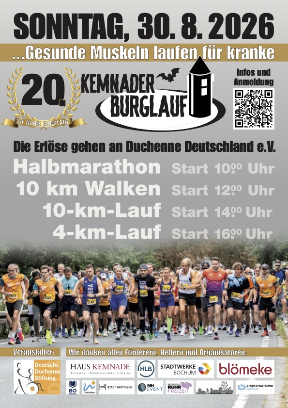 Der Kemnader Burglauf zugunsten muskelkranker Kinder ist ein bedeutender Tag für unsere Duchenne Familien. Bereits zum 18. Mal konnte dieses Laufevent auf der Wasserburg Haus Kemnade stattfinden und wir danken den neuen Burgherren Josef Kachel und Matthias Hoffmann sowie ihrem Team für die engagierte Unterstützung.